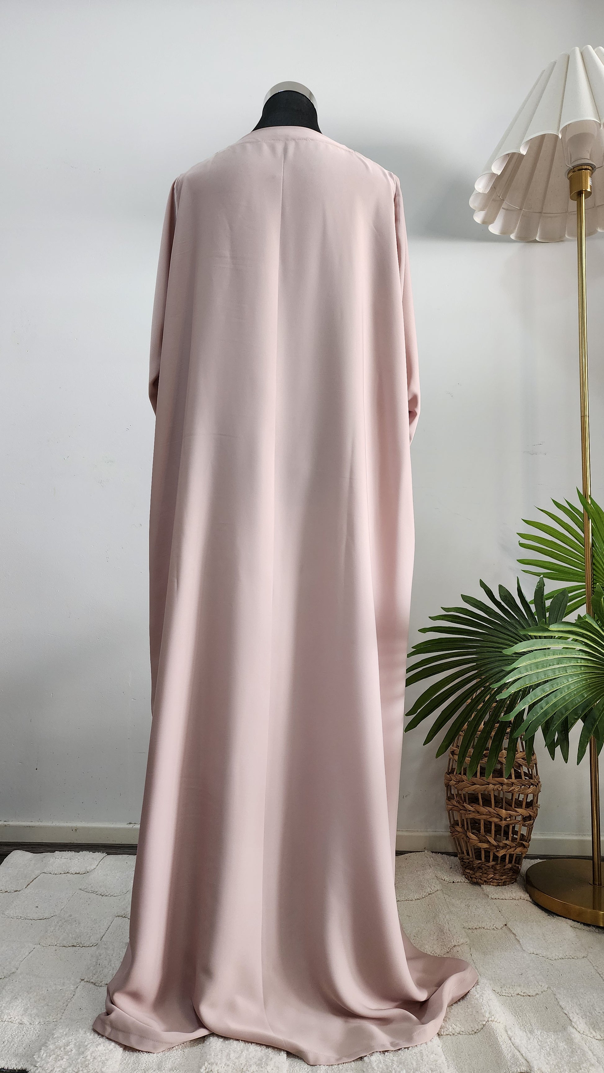 Chic and graceful, this beige abaya features delicate hand embroidery along the front and sleeves, adding a soft, feminine touch to its timeless design. With a flowy silhouette and refined details, it’s perfect for casual outings, gatherings, or special occasions in modest fashion.