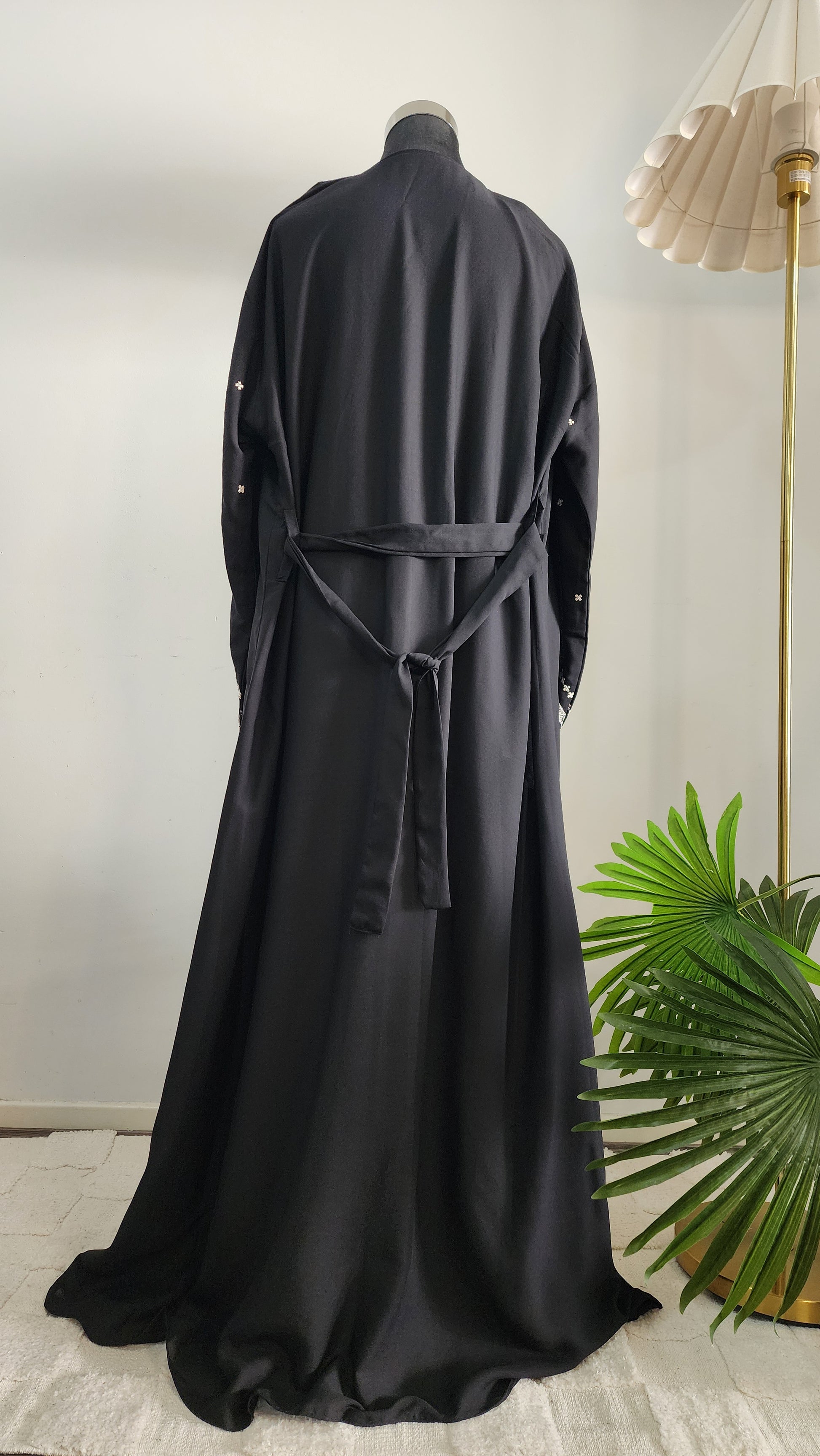 Black and White double layered Embroidered Abaya with Belt– Contemporary Modest Elegance