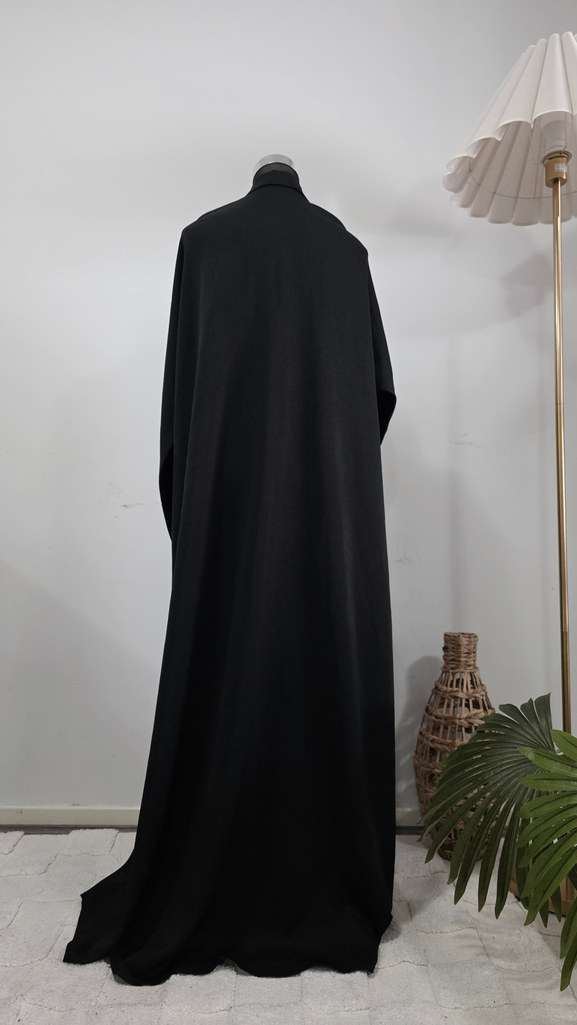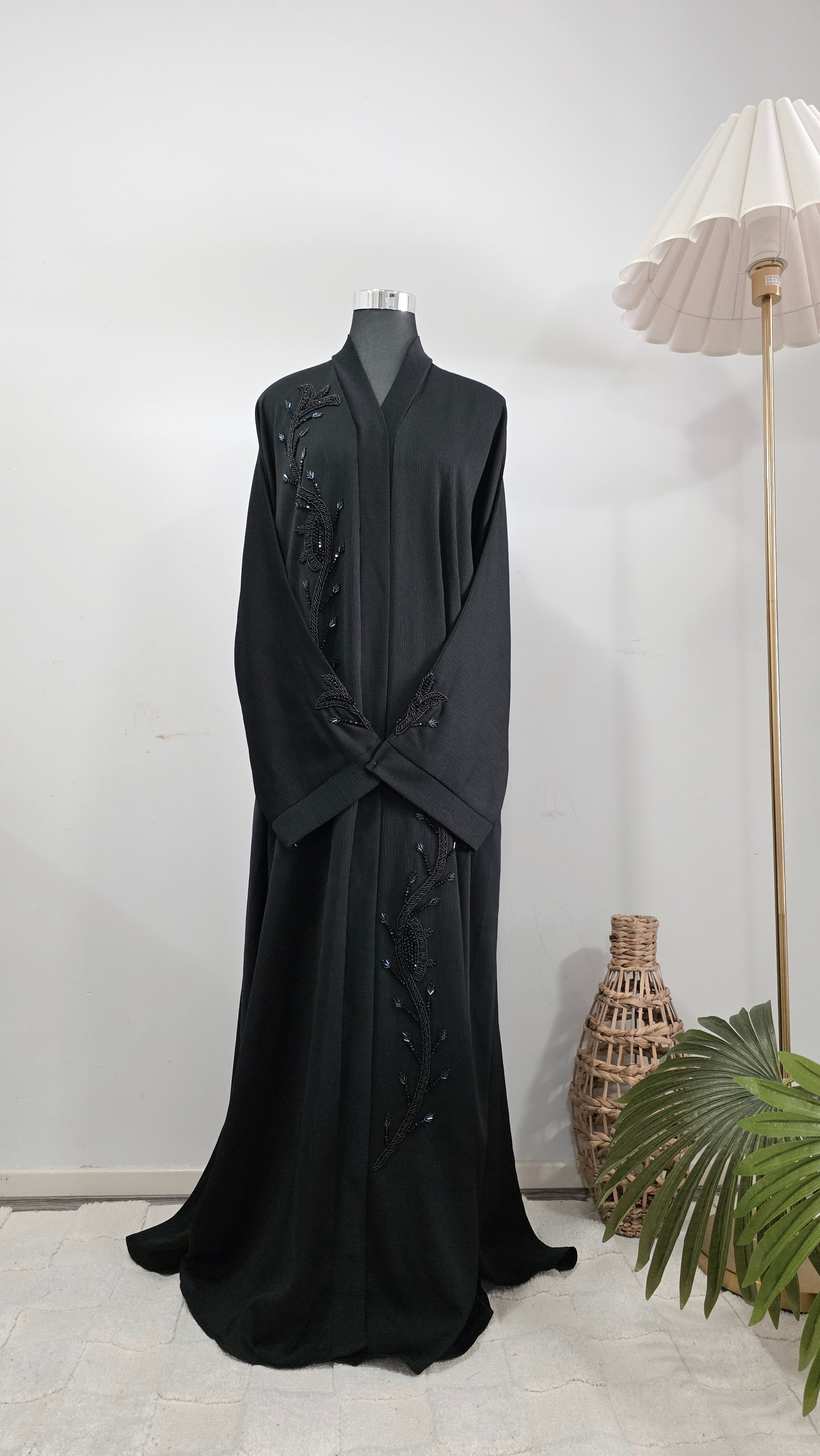An elegant black abaya crafted from premium textured fabric, featuring intricate beadwork along the front and sleeves. Lightweight, flowy, and refined, it offers effortless sophistication for formal events or modest everyday wear.