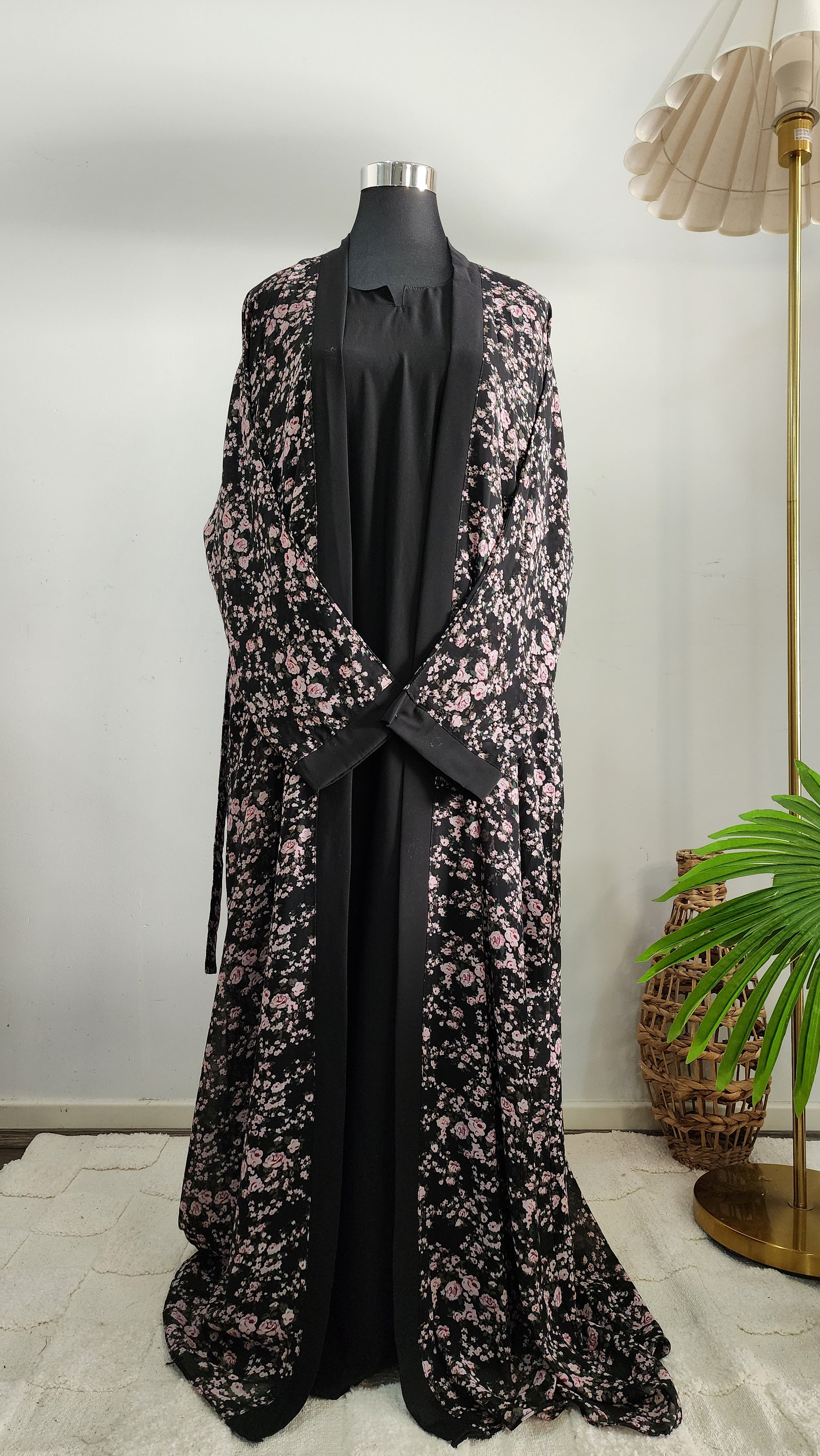 Black double layered Abaya with Floral Printed Cardigan– Elegant Modest Wear