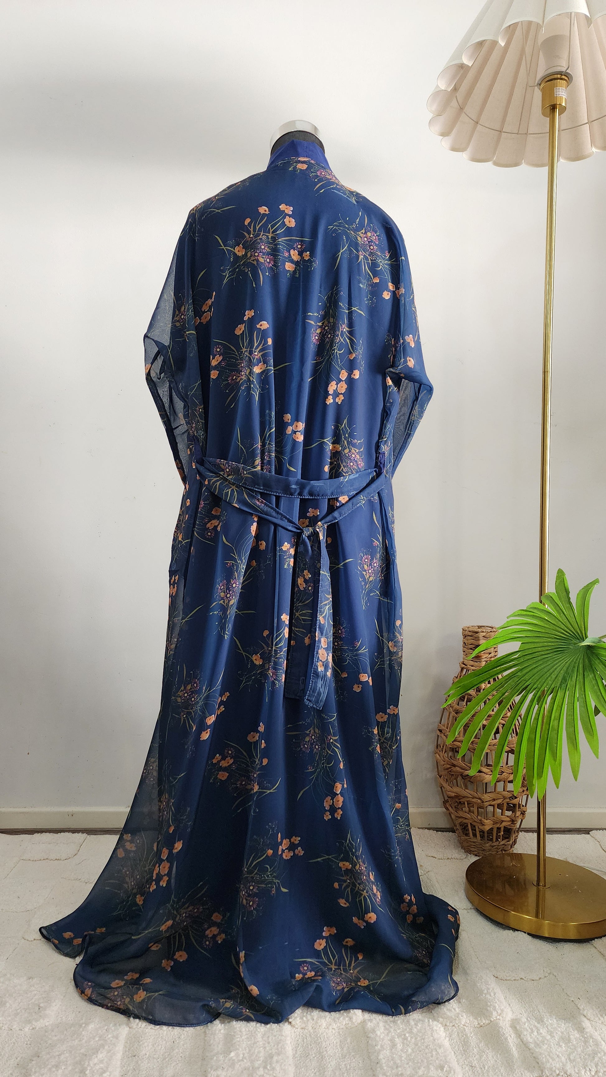 Discover timeless elegance with this blue abaya, featuring a plain inner long sleeved dress and a floral-printed chiffon cardigan. Lightweight, flowy, and perfect for everyday wear or special occasions. Ideal for modest fashion lovers seeking comfort and style.