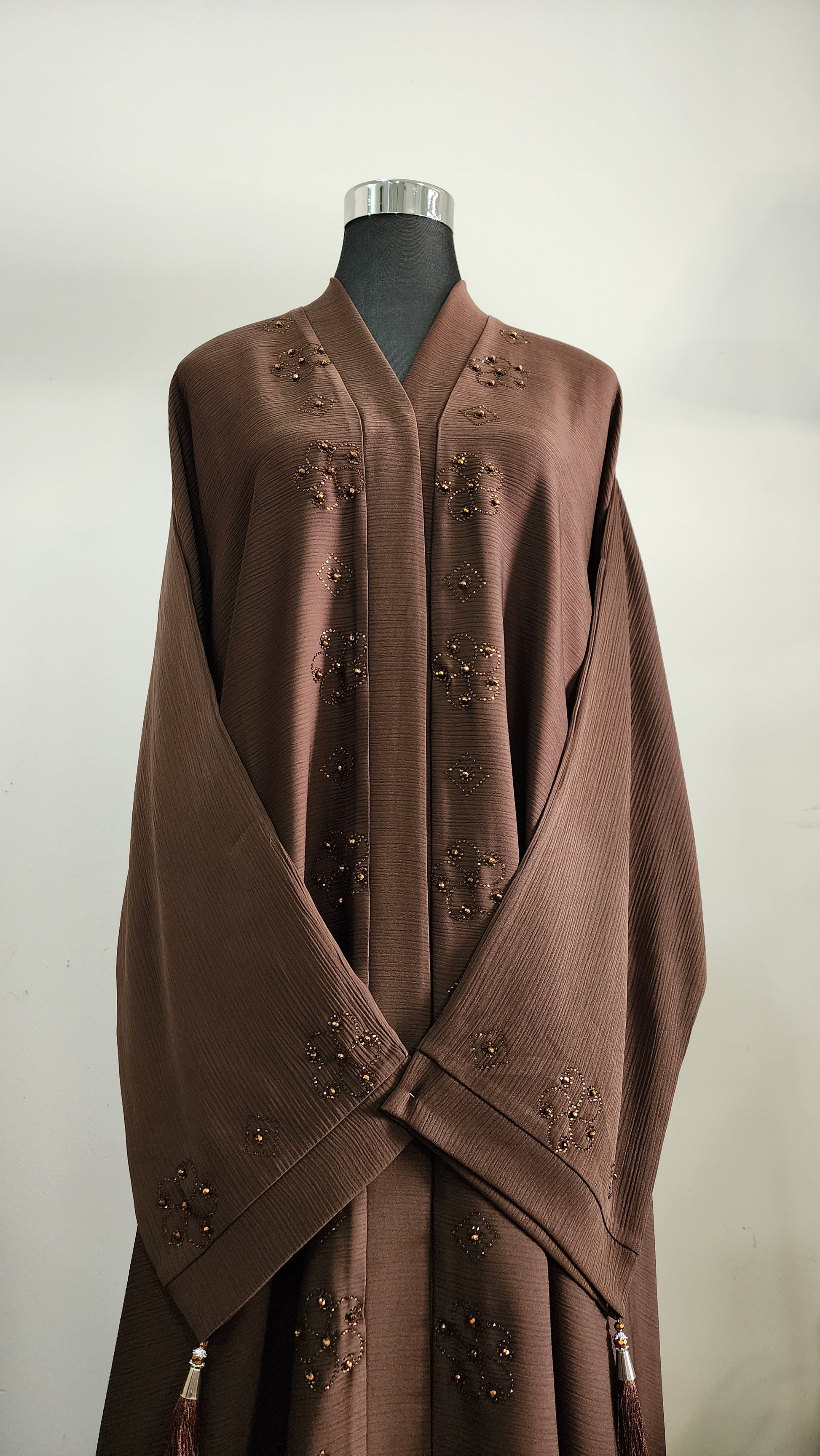Brown Abaya with Beaded Detailing and Tassel Accents – Modern Modest Elegance