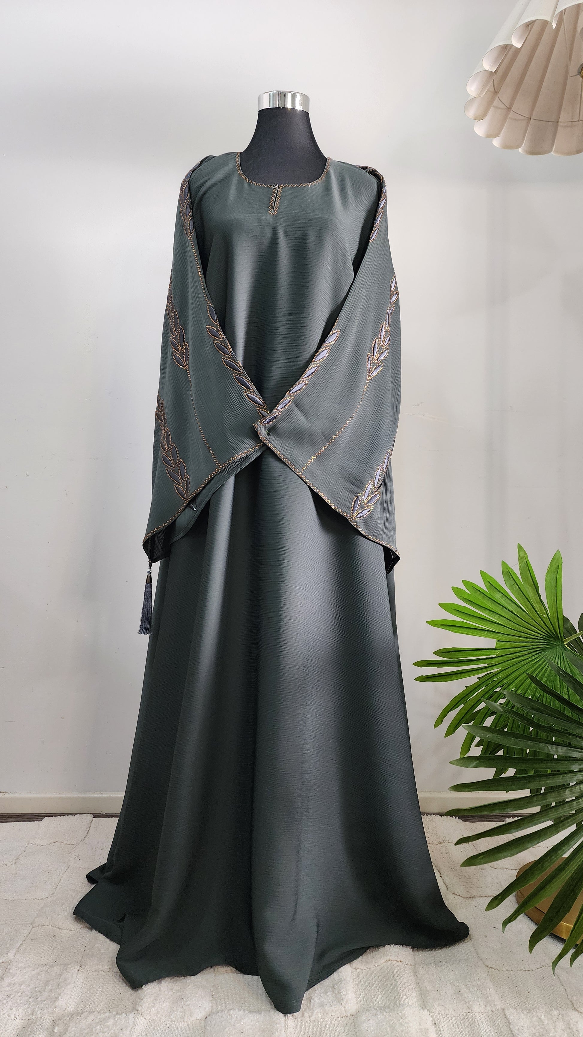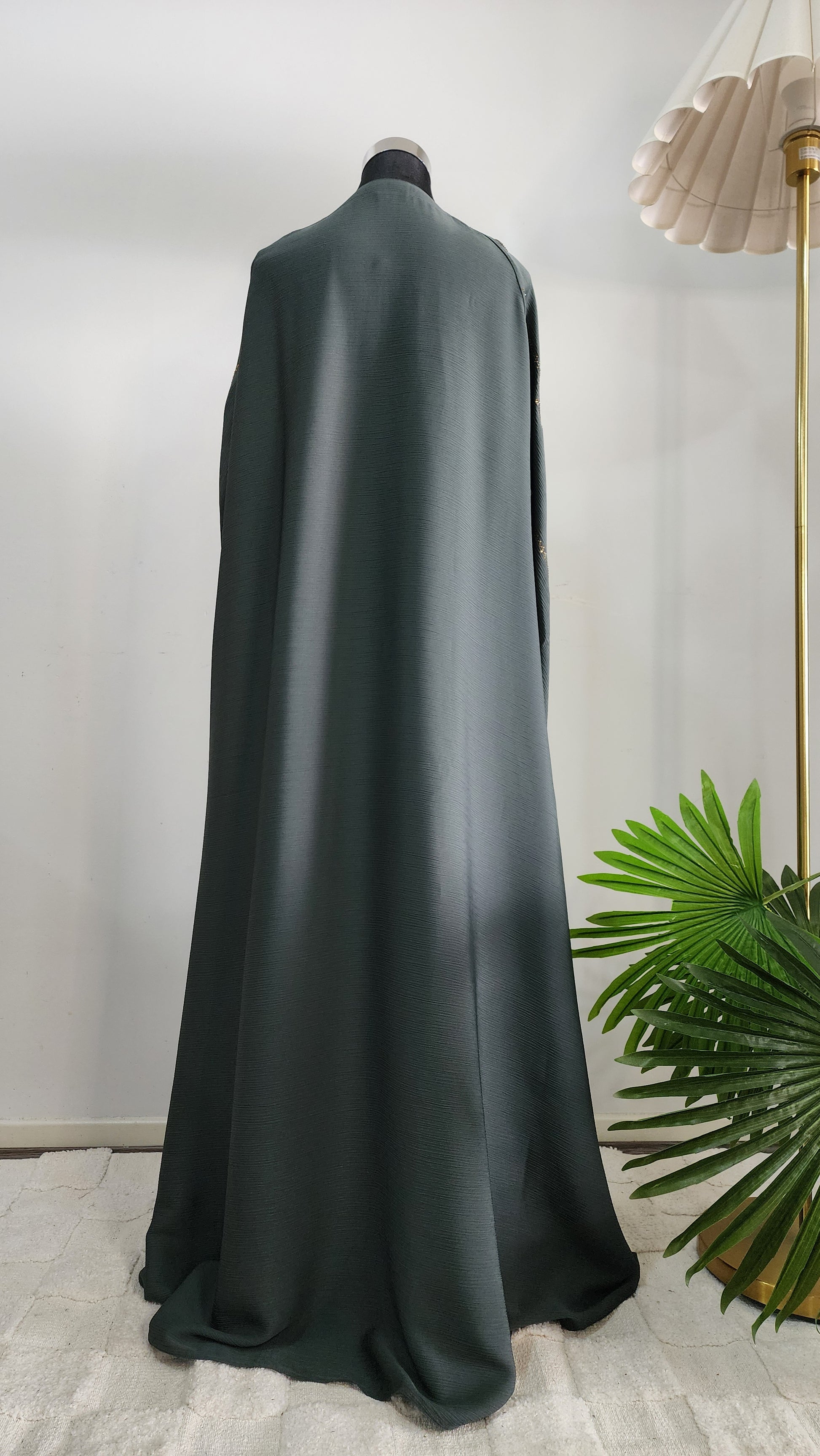 This olive green abaya features exquisite embroidery with golden diamantes detailing along the sleeves and neckline. Crafted from premium textured fabric with a graceful drape and subtle tassel accents — perfect for women seeking timeless, sophisticated modest fashion.