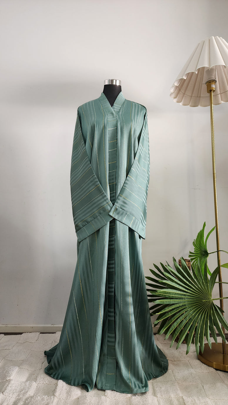 Sage Green Striped Abaya with Subtle Gold Detailing – Elegant Modest Wear